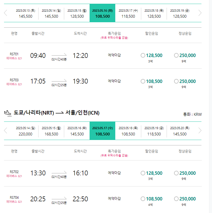 참고로 5월달 항공권을 보니, 아래와 같이 가격이 나오네요.