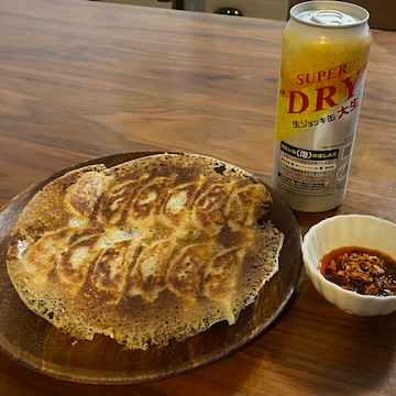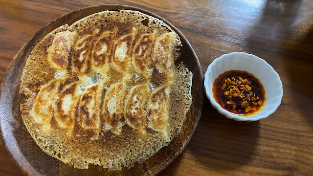 마지막으로 접시에 뒤집어 주면 아래와 같이 먹음직 스러운 만두를 완성할 수 있습니다. 일본에서는 만두를 간장에 찍어먹기도 하는데요. 그보다는 아래 사진에 보이는 것처럼 라유와 같이 먹기도 합니다. 아래 소스는 일본 슈퍼마켓에서 일반적으로 판매하고 있는 제품인데요. 라유에 마늘 튀김이 들어가 있어서 식감도 좋고 만두와 같이 먹으면 찰떡 궁합니다. 일본 여행오시면 만두 어떠신가요?