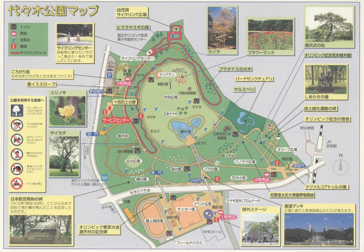 요요기 공원 하라주쿠 문에서 들어가 조금 걸으면 광대 한 잔디 지역인데요. 이곳은 "파노라마 광장"입니다. 1912년 도쿄시가 미국에 100그루의 벚꽃을 기증했습니다. 그 100주년 기념으로 미국 정부로부터 선물된 100개의 나무가 심어져 있습니다. 이 파노라마 광장과 중앙 광장을 연결하는 전망 데크에서는 신주쿠의 빌딩과 요요기 공원을 한눈에 볼 수 있습니다. A 지구와 B 지구의 왕래도 이 덱에서 가능합니다. 장미원도 설치되어 있으며, 5월 중반에는 30종 이상의 장미가 대지를 장식합니다.