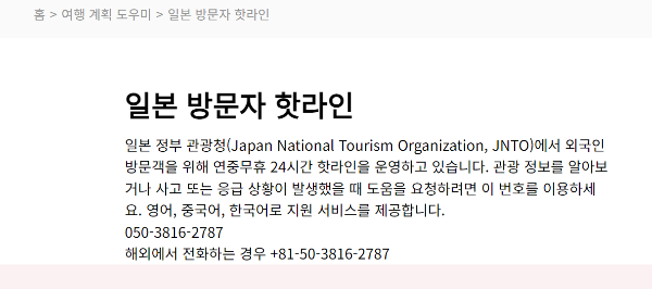 일본 정부 관광청(Japan National Tourism Organization, JNTO)에서 외국인 방문객을 위해 연중무휴 24시간 핫라인을 운영하고 있습니다.