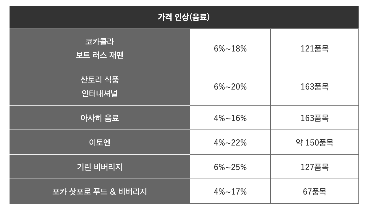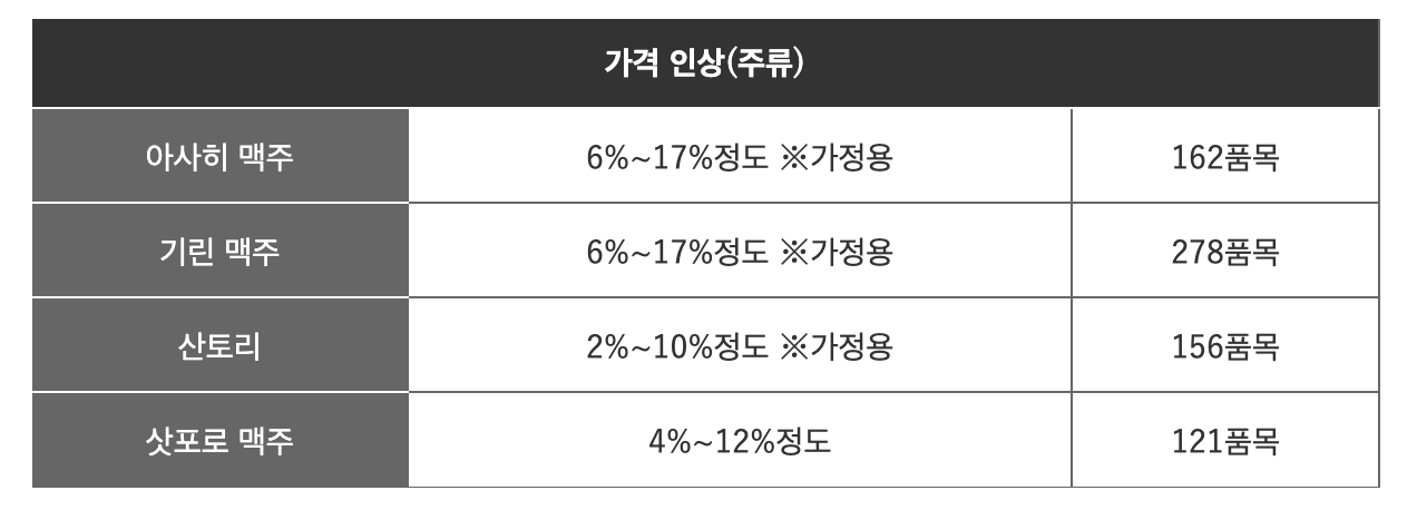맥주나 발포주, 츄하이, 위스키 등 알코올 음료 등, 가정용과 업무용의 278 품목, 10월 1일 납품분으로부터, 가정용은 매장 상정 가격으로, 맥주계 음료, 츄하이, 무알코올음료 6%에서 13% 정도, 위스키, 보드카 등 수입 양주가 7%에서 17% 정도, 가격 인상 전망.