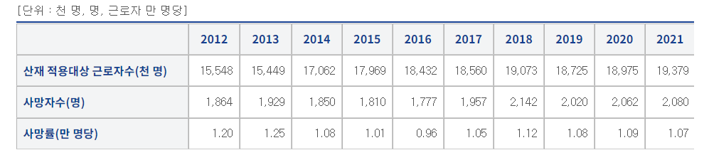 반면 우리나라는 어떨까요. 아래 표는 국가지표치계 홈페이지에서 캡처한 산업재해 사망자수와 사망률에 대한 표입니다.