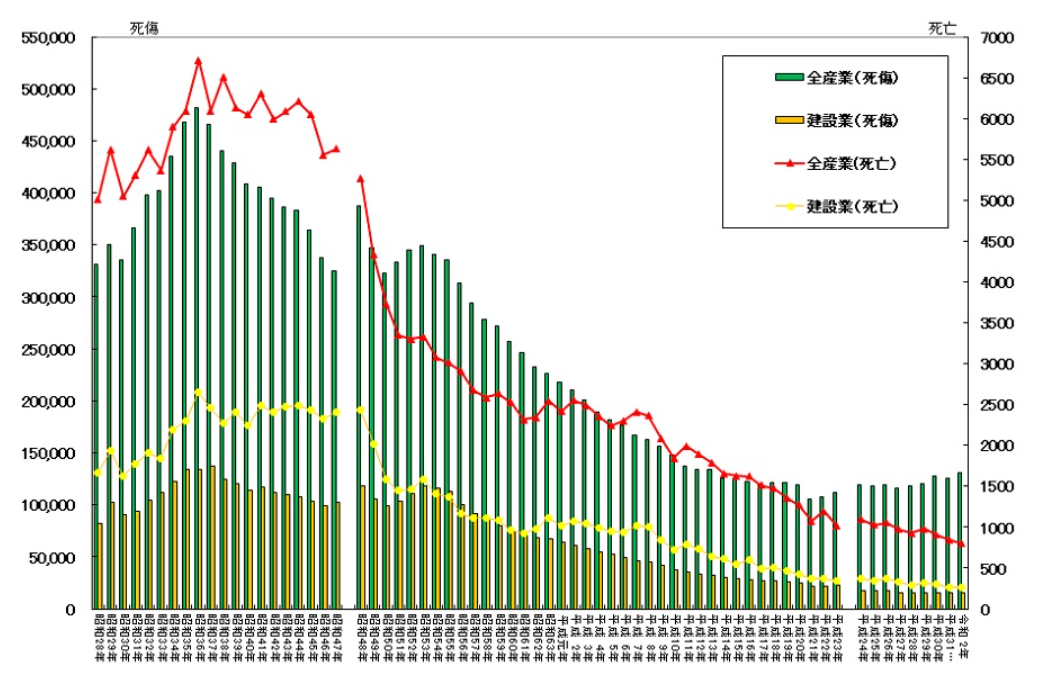 그리고 아래는 1953년부터 2020년까지 산업재해 사고 경향 그래프입니다. 빨간건이 사망자수 있은데요.(오른쪽 X축이 사방 자축) 1960년대의 경우 거의 7000명까지 사망자가 있었네요. 일본도 이렇게 옛날에는 산업재해 사고가 많았습니다.