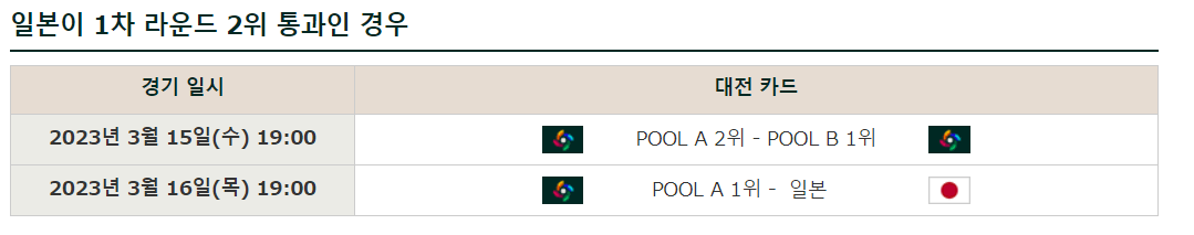 아래는 일본이 예전을 1위, 2위로 통과했을때의 경기일정입니다.