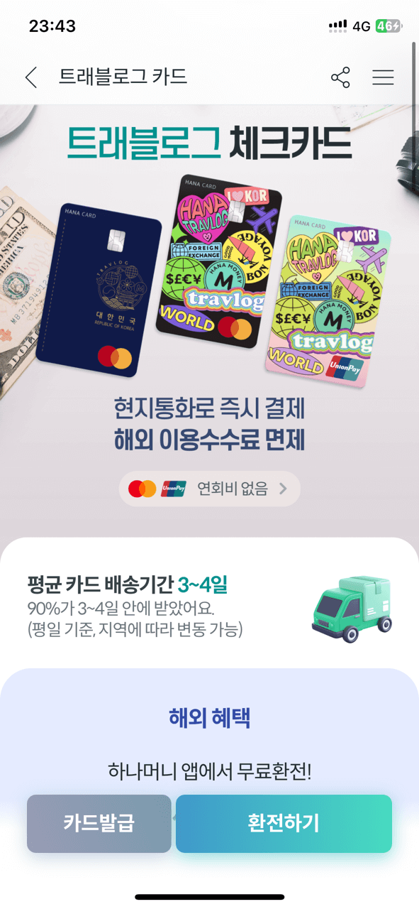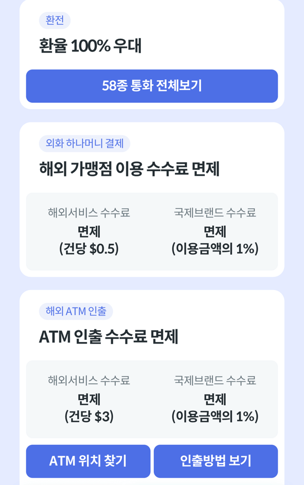 - 해외 결제 시 3% 하나머니 적립 혜택이 있어요.